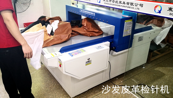 启航家具沙发皮革皮套检针机使用现场。皮革等大件沙发包皮通常具有金属元素效应,普通检针机通常无法胜任。连之新1米宽幅沙发皮套检针机专为启航家具定制,机器长度2米,检测宽度1米,检测高度25厘米。可检测1.5mm铁!