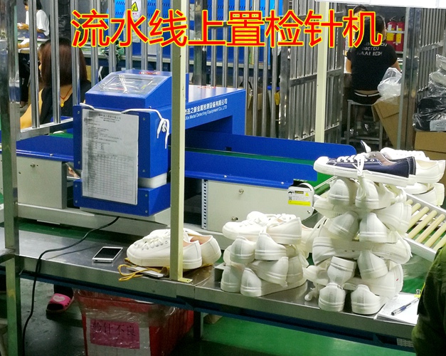 鞋子经过几道检针后,装盒子了再检测一边方可装箱: