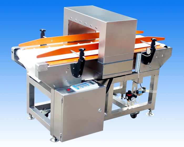 报警方式:检测到金属异物自动停机倒带,并蜂鸣器报警,可选装翻板、吹气、推杆、升降排除等剔除机构!