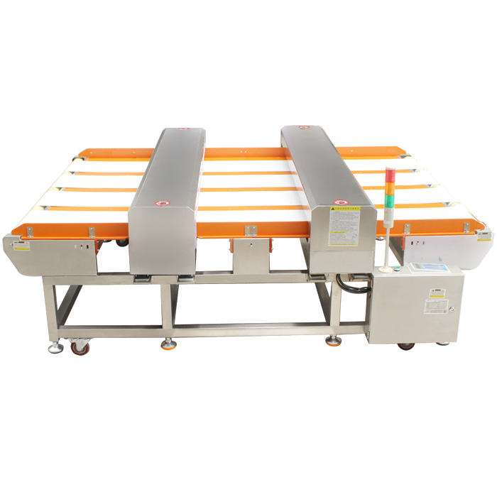 客户定制的双系统探测型数字式金属检测机,整机采用304不锈钢设计制作,并且前探头采用传统检针机制作有位置指示灯功能,第二组探头为全金属检测机系统,可检测出细小的铁、铜、铝、不锈钢等所有金属异物。